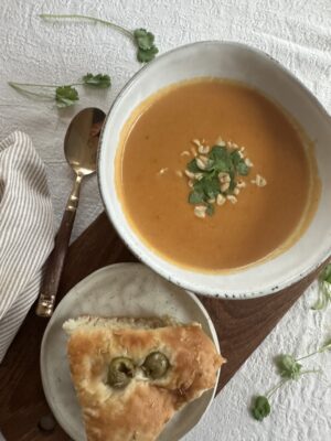 Servera soppan toppad med jordnötter och koriander tillsammans med Focaccian.